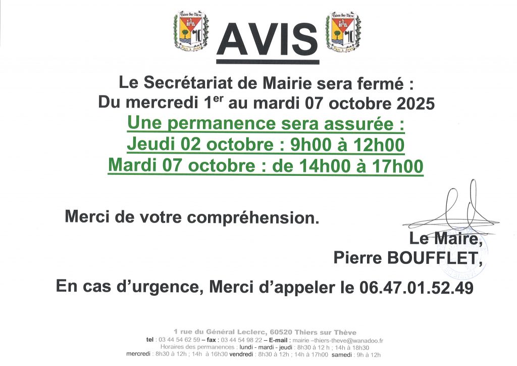 Bonjour à toutes et à tous, le secrétariat de mairie sera fermé du1er au 07 octobre 2025. Une permanence sera assurée.