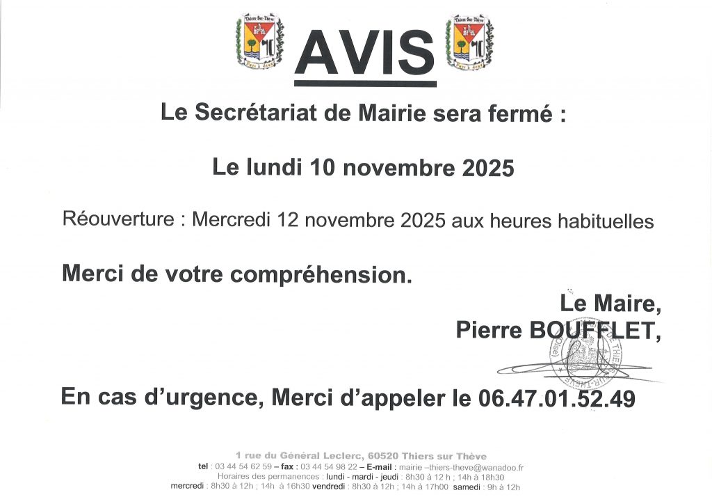 le secrétariat de Mairie sera exceptionnellement fermé le 10 novembre 2025.