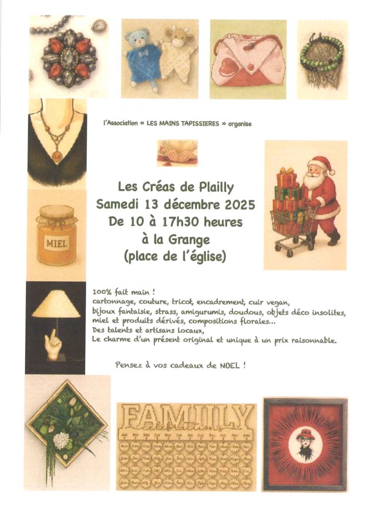 l’Association « LES MAINS TAPISSIERES » organise à Plailly le Samedi 13 décembre 2025 « les Créas de Plailly ».