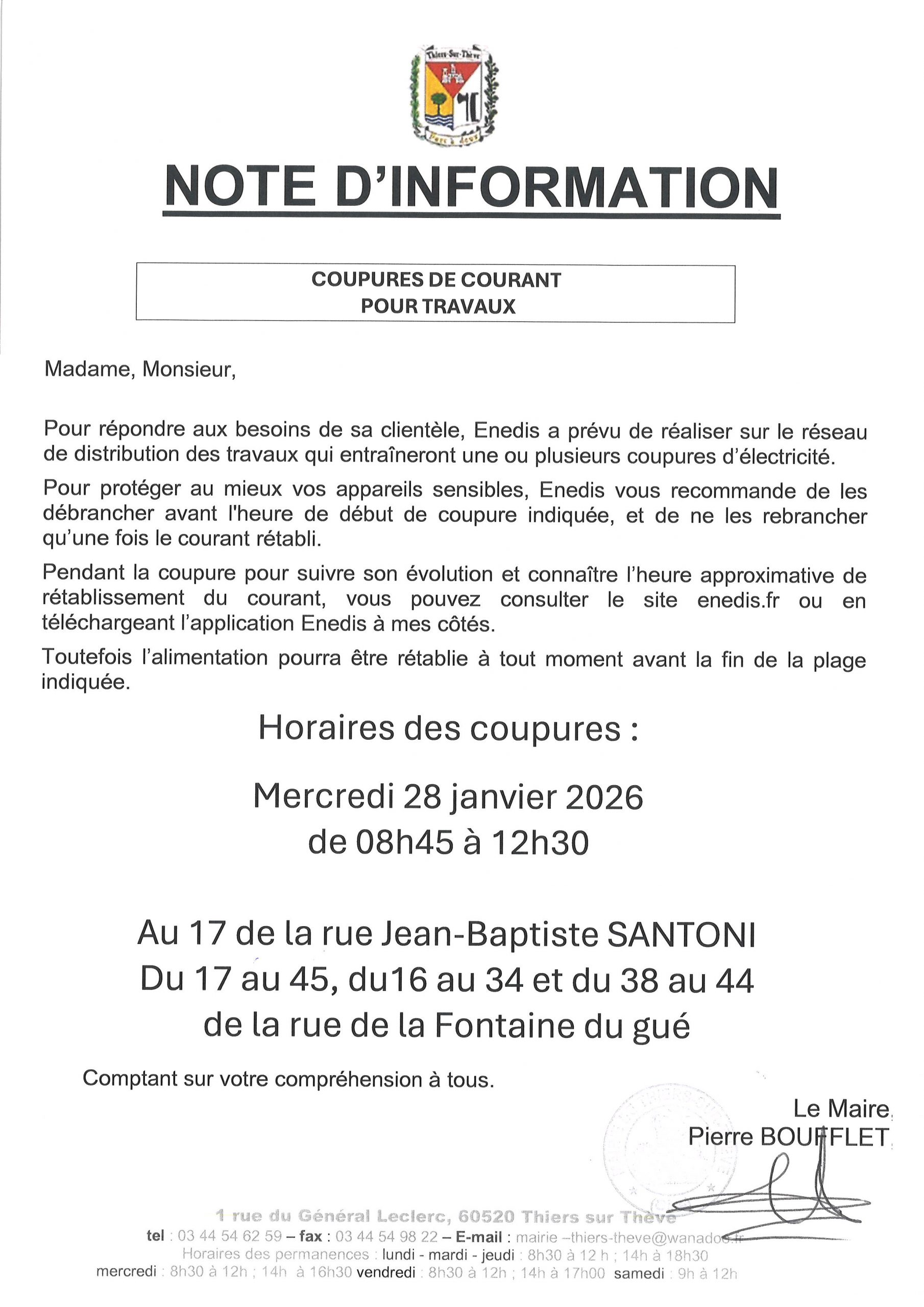 COUPURES DE COURANT – RUE DE LA FONTAINE DU GUE – 28 JANVIER 2026