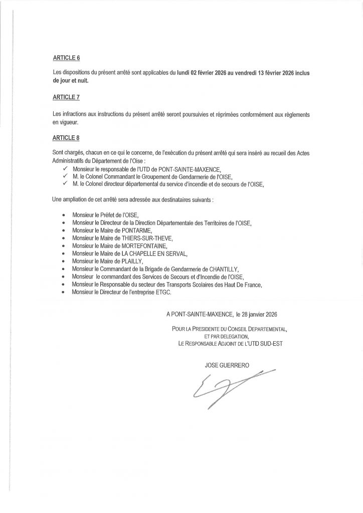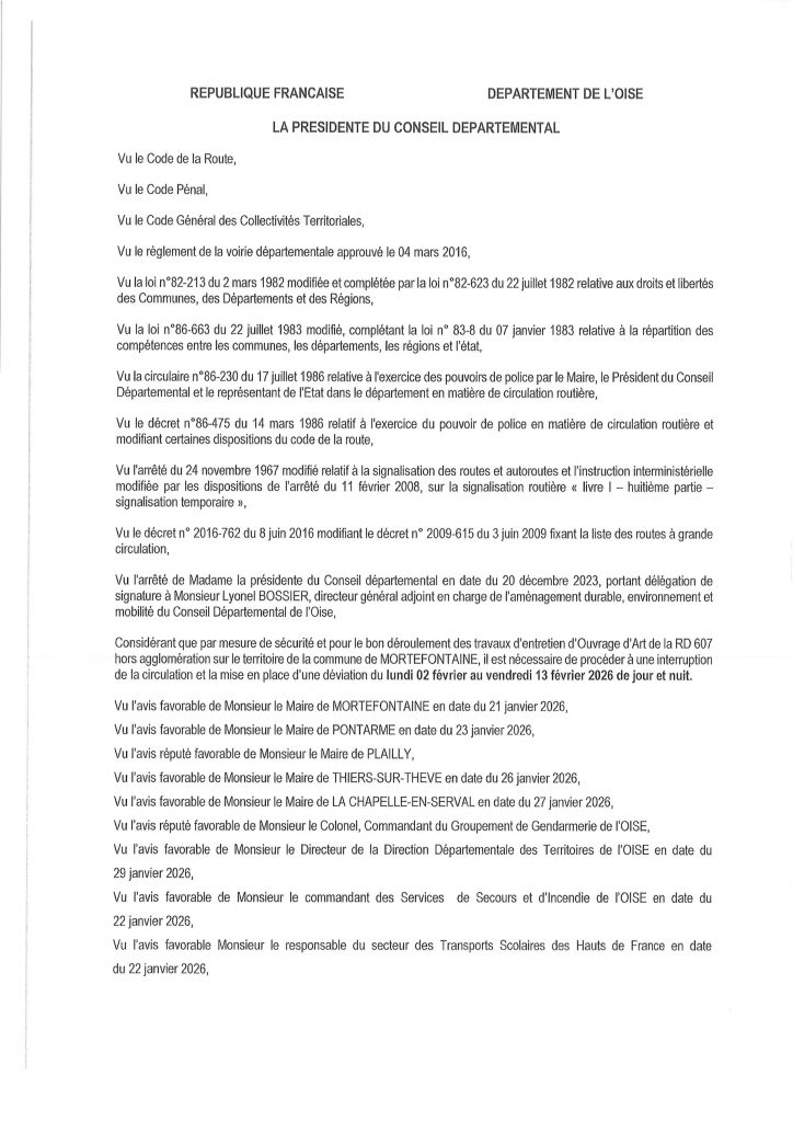 Ci-dessous arrêté du Conseil Départemental de l’Oise concernant une déviation de la RD607 à la sortie de Thiers sur Thève (après le Pont de l’autoroute) en direction de Mortefontaine.