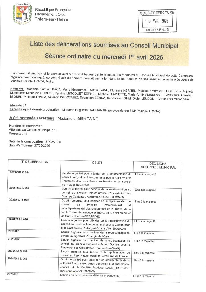 LISTE DES DÉLIBÉRATIONS SOUMISES AU CONSEIL MUNICIPAL DU 1ER AVRIL 2026