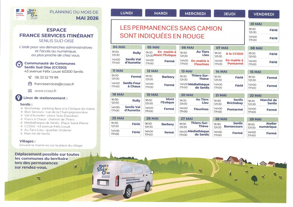 Veuillez trouver ci-joint le planning de l’espace France Services Itinérant pour le mois de mai 2026.