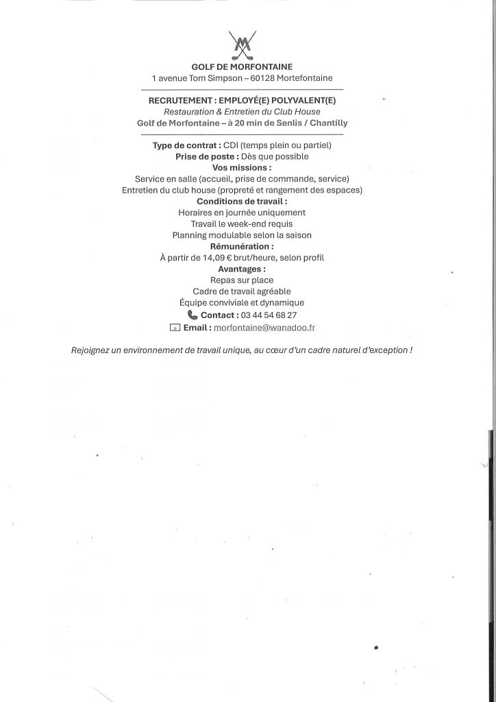 le Golf de Mortefontaine recherche un(e) employé(e) polyvalent(e).